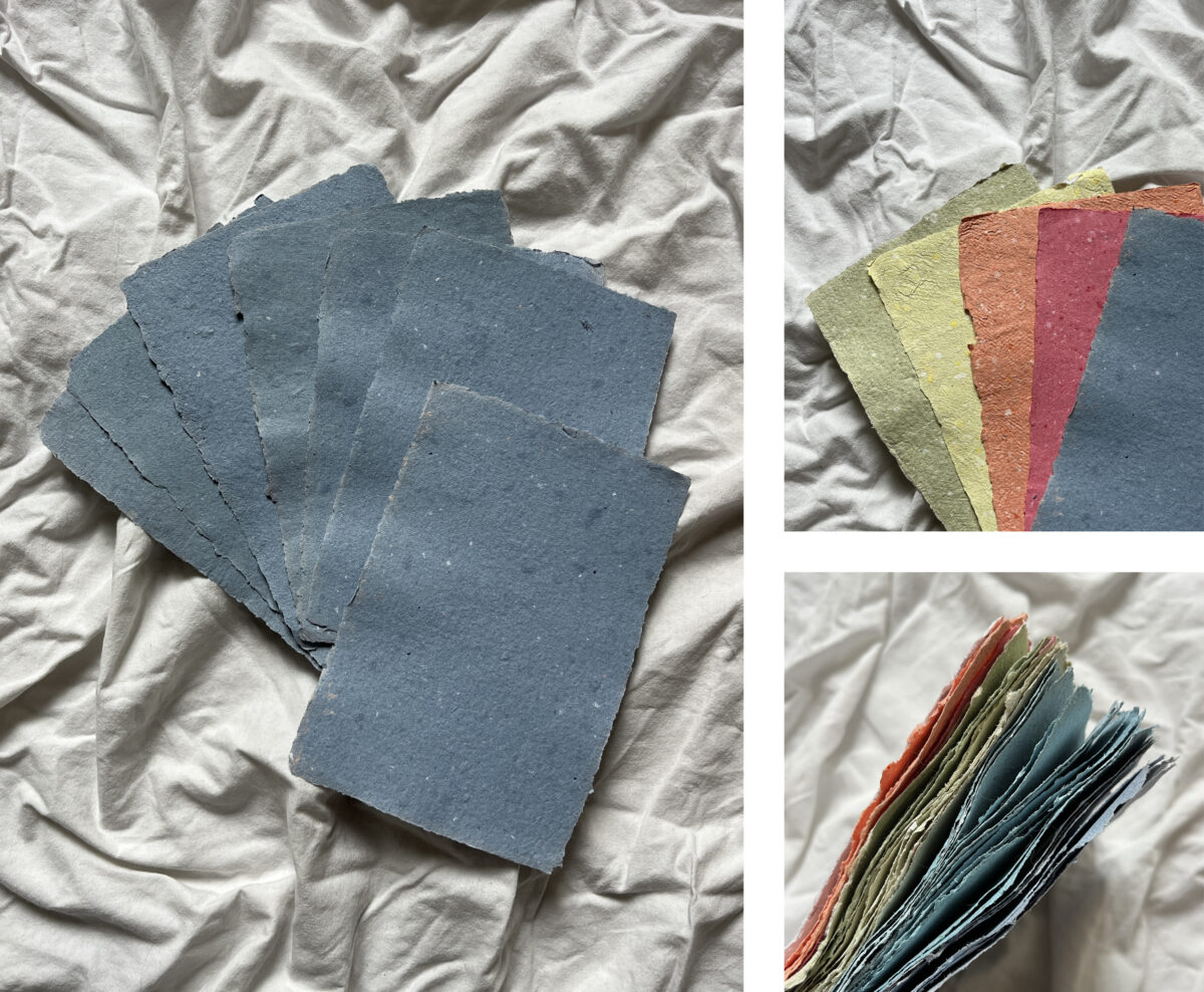 Le papier est fabriqué à la main dans mon atelier, en Bretagne à partir de chûtes de papiers collectées auprès d’écoles locales. Chaque page est unique, avec une bordure naturelle et des nuances variables.