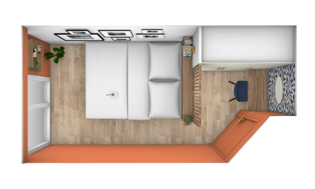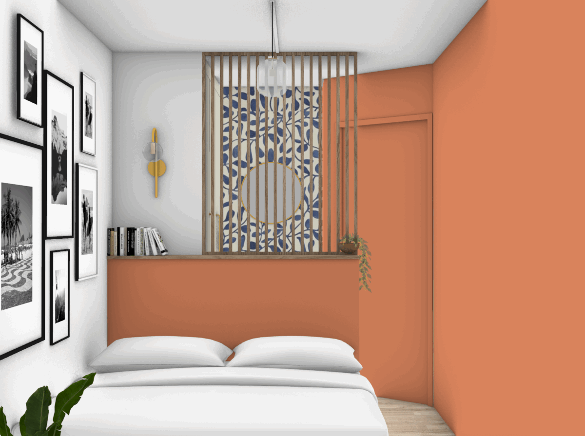 Selon le cahier des charges, la chambre devait pouvoir accueillir un espace dressing, un bureau/coiffeuse et un lit de 160x200cm, sans toucher aux parois ou à la porte (projet de décoration d’intérieur). Pari tenu : une demi cloison vient séparer l’espace nuit, avec vue sur l’extérieur, surmontée d’un claustrat, afin de laisser la lumière pénétrer dans l’espace dressing et coiffeuse. La couleur terracotta et la tapisserie bleue dans le fond viennent donner du charme et du caractère à cette petite pièce.