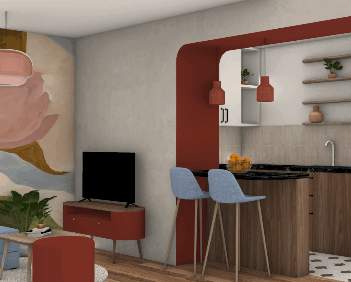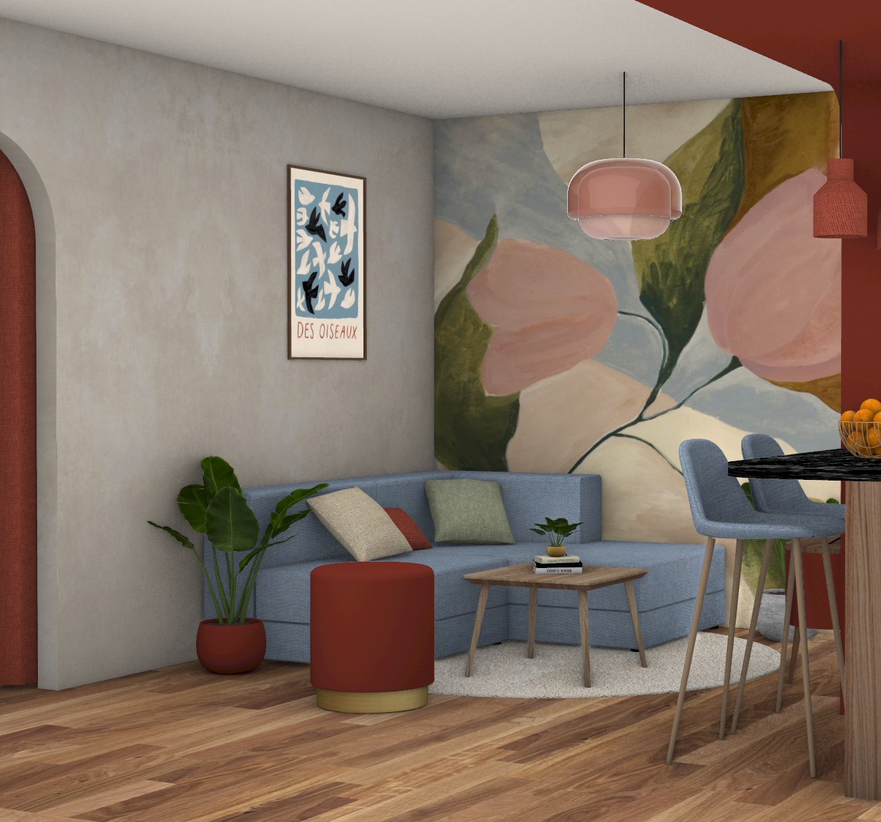 Les couleurs, osées et chaleureuses, viennent sublimer l’espace et créer une atmosphère enveloppante et originale.
