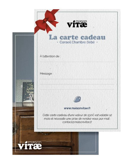 D’une valeur de 150€ pour le « Conseil chambre bébé » ou de 450€ pour le « Projet chambre bébé », les cartes cadeaux Maison Vitae sont idéales pour faire plaisir autour de vous !